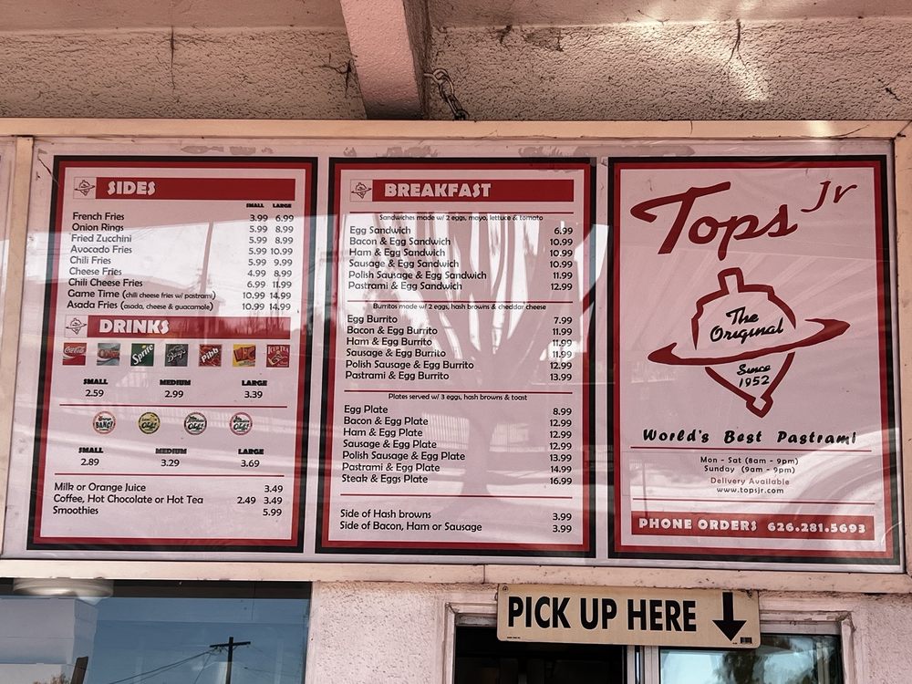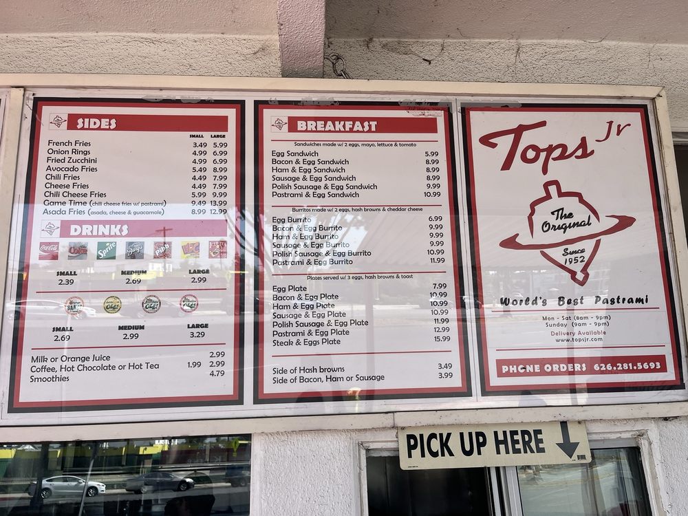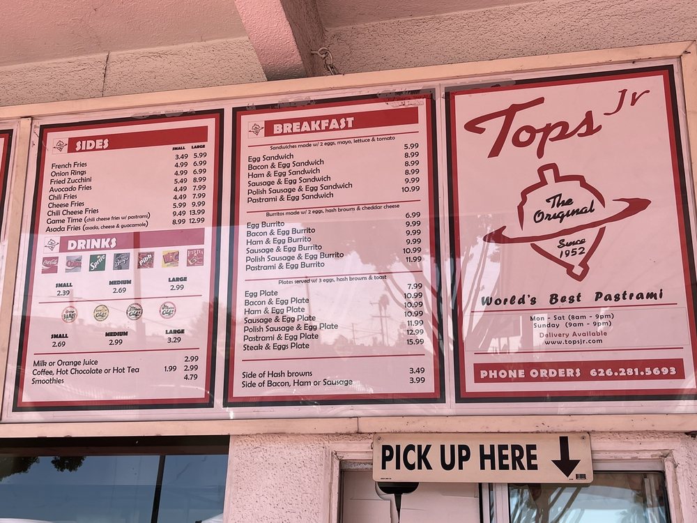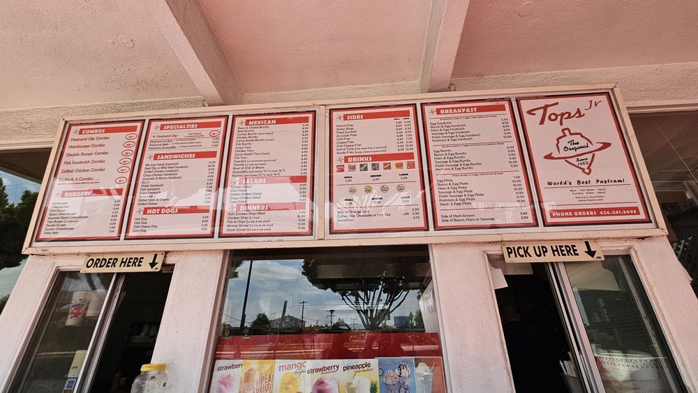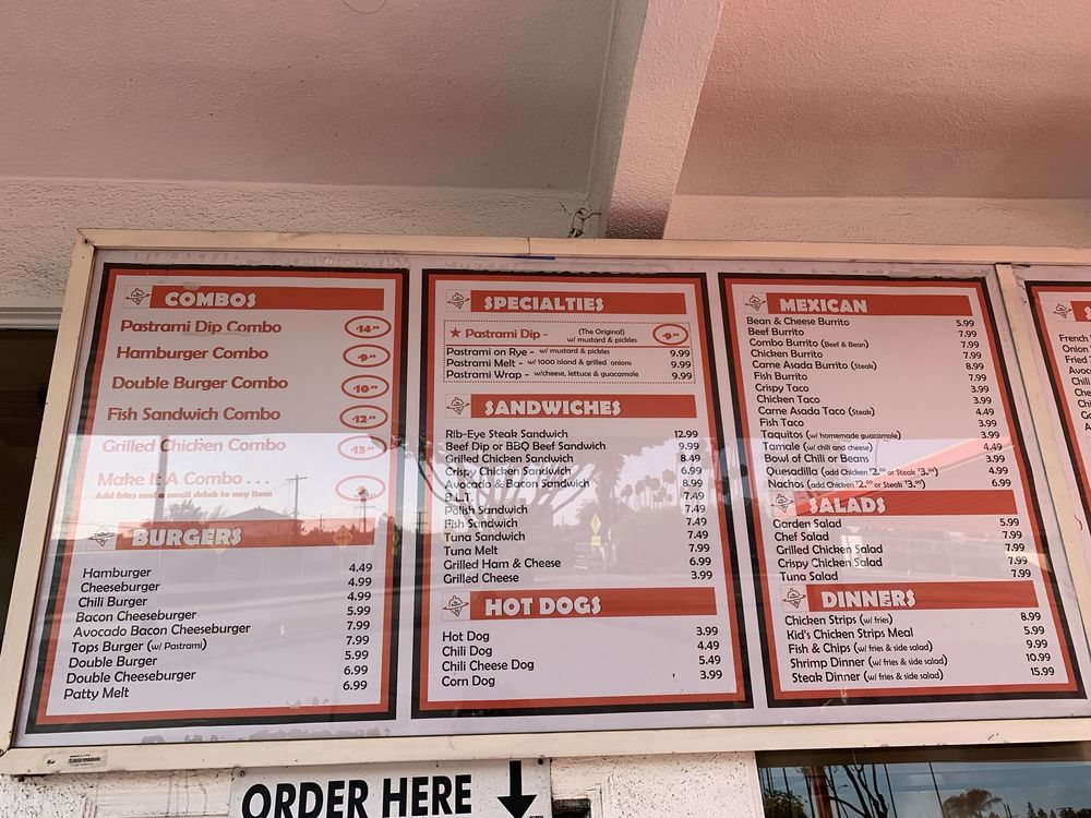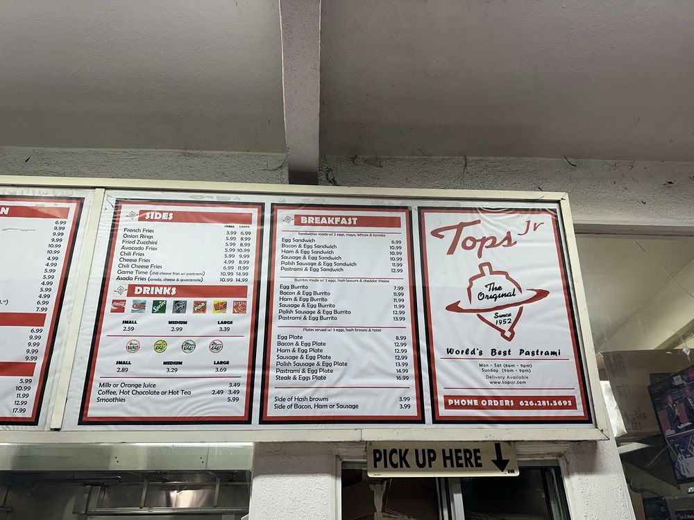 Tops Jr, located in Alhambra, CA, is a go-to spot for delicious sandwiches and burgers. Offering convenient options like delivery, takeout, and reservations, Tops Jr also features vegetarian options for all to enjoy. Their specialties include the mouth-watering Pastrami Dip, Pastrami Melt, Pastrami on Rye, and Pastrami Quesadilla, all priced at $12.99. Combo options like the Pastrami Dip Combo and Grilled Chicken Sandwich Combo come with sides for a complete meal experience. The breakfast menu offers satisfying options like the Breakfast Burrito and Breakfast Plate. Reviews from satisfied customers highlight the friendly staff, quick service, and tasty offerings. With outdoor seating and a casual atmosphere, Tops Jr is an ideal location for a meal with friends or family. Experience the flavors of Tops Jr for yourself and discover why it's a local favorite.