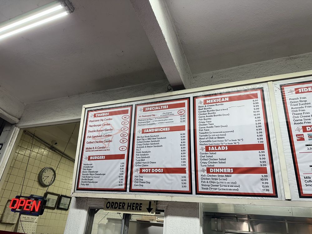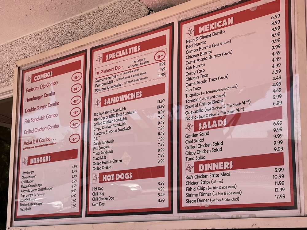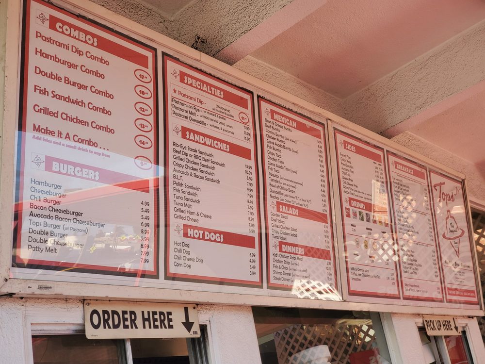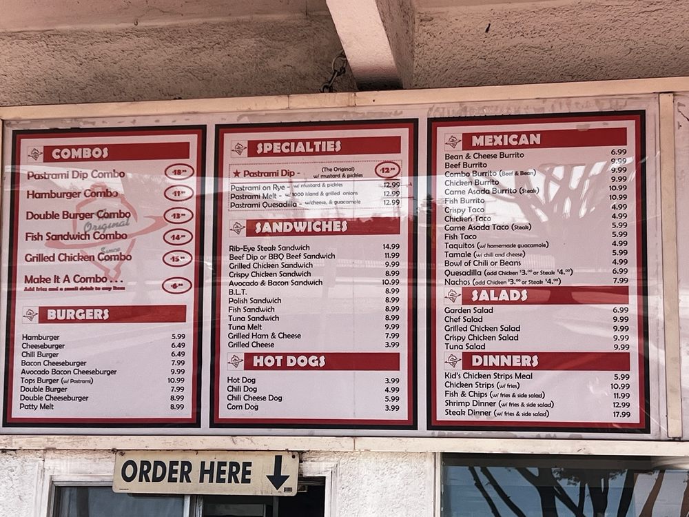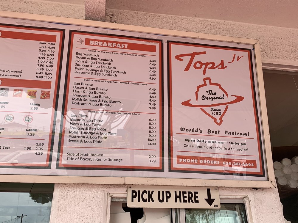 Tops Jr, located in Alhambra, CA, is a go-to spot for delicious sandwiches and burgers. Offering convenient options like delivery, takeout, and reservations, Tops Jr also features vegetarian options for all to enjoy. Their specialties include the mouth-watering Pastrami Dip, Pastrami Melt, Pastrami on Rye, and Pastrami Quesadilla, all priced at $12.99. Combo options like the Pastrami Dip Combo and Grilled Chicken Sandwich Combo come with sides for a complete meal experience. The breakfast menu offers satisfying options like the Breakfast Burrito and Breakfast Plate. Reviews from satisfied customers highlight the friendly staff, quick service, and tasty offerings. With outdoor seating and a casual atmosphere, Tops Jr is an ideal location for a meal with friends or family. Experience the flavors of Tops Jr for yourself and discover why it's a local favorite.